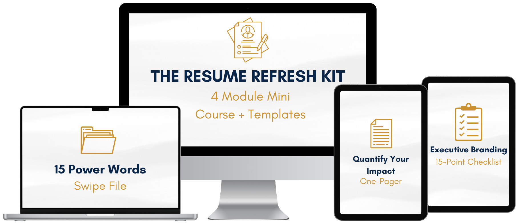You are getting the complete Resume Refresh Kit with 5 comprehensive modules covering executive branding, resume architecture, strategic tailoring, achievement amplification, and power language. You're getting multiple professional resume templates (Standard, Creative, Functional formats), step-by-step video walkthroughs, and three powerful bonuses: the Executive Branding Checklist, Quantify Your Impact One-Pager, and 15 Power Words Swipe File. Everything is available instantly upon purchase.